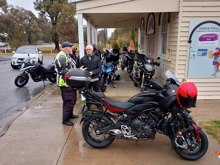 So much for plans going awry. Despite that, we had a great turn up, a nice ride via back roads to Healesville, a great run over the Black Spur to Dom Dom Saddle (zero traffic) and then a car actually pulled over to let us pass. We had a great (very light traffic) ride to Yarck where we stopped, had a hot drink and snack and decided to continue.
